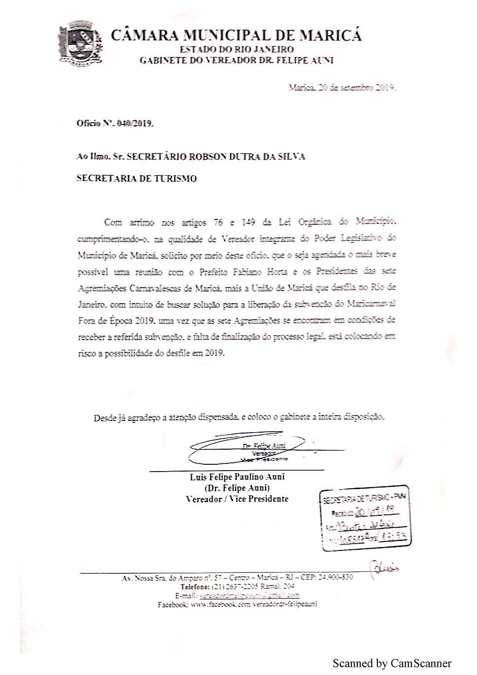 O Presidente Executivo da LACAM (Liga das Agremiações Carnavalesca de Maricá), Bruno Jorge Correa Brum, em seu documento, apresenta ao vereador Dr. Felipe Auni algumas preocupações do mundo do samba com a indefinição até o momento, da realização do evento que consta inclusive, no calendário oficial da cidade: